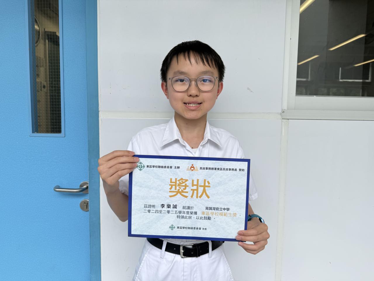 2D李樂誠 、3D賴峻鋒及5D吳韋霖榮獲由東區學校聯絡委員會主辦的東區學校模範生獎,以表揚同學在品德和學業成績的卓越表現。