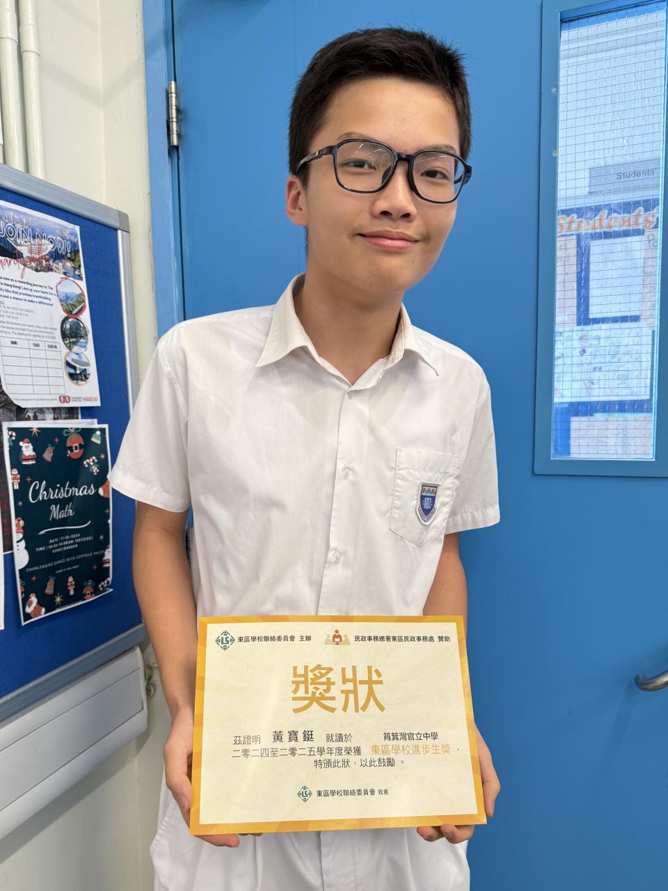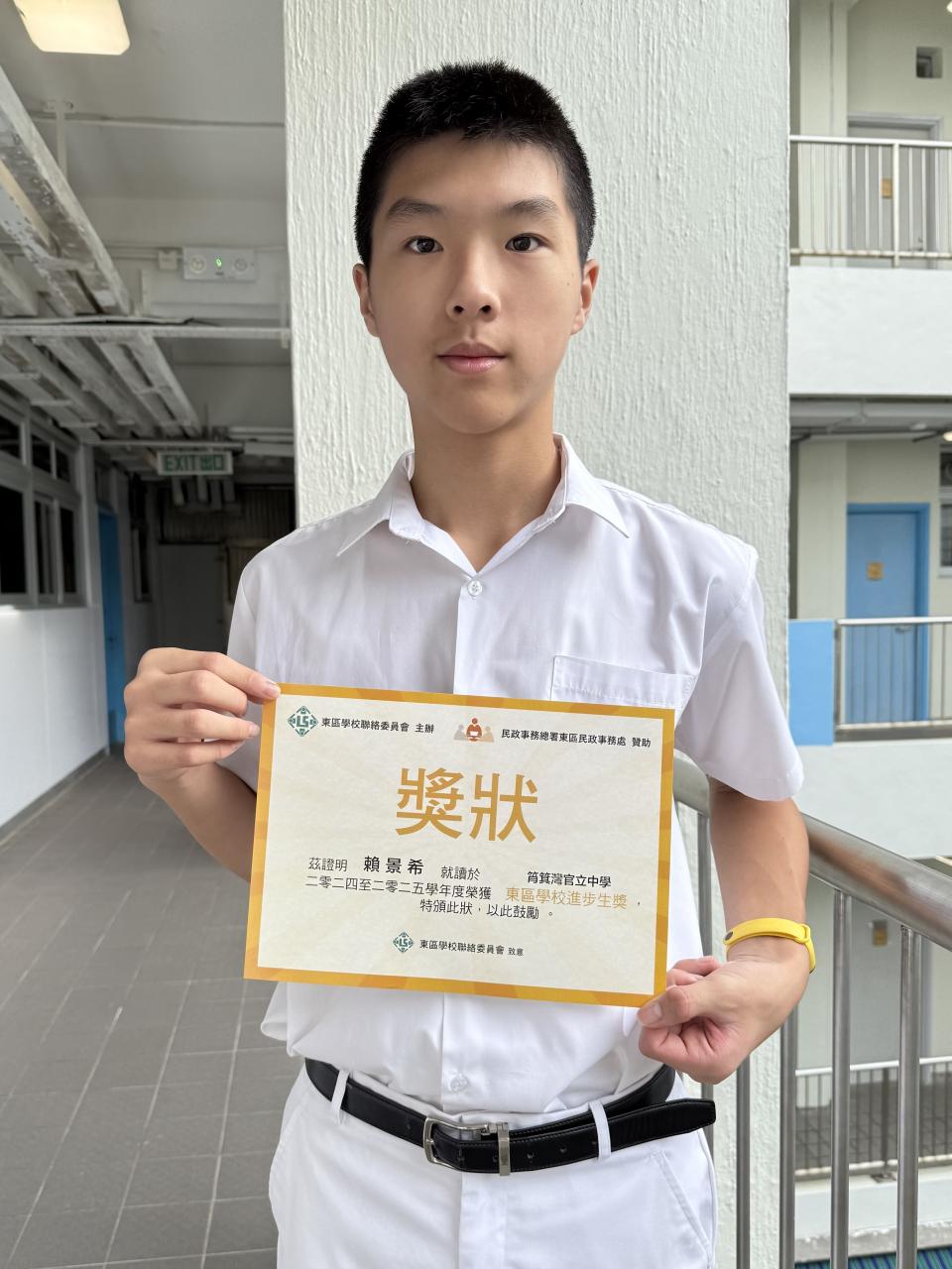 另外6D吳靖晞、5A胡駿康、4A黃寶鋌、3D林燦鑫及2D賴景希獲東區學校進步生獎,以表揚同學在本年度上學期成績有顯著進步。