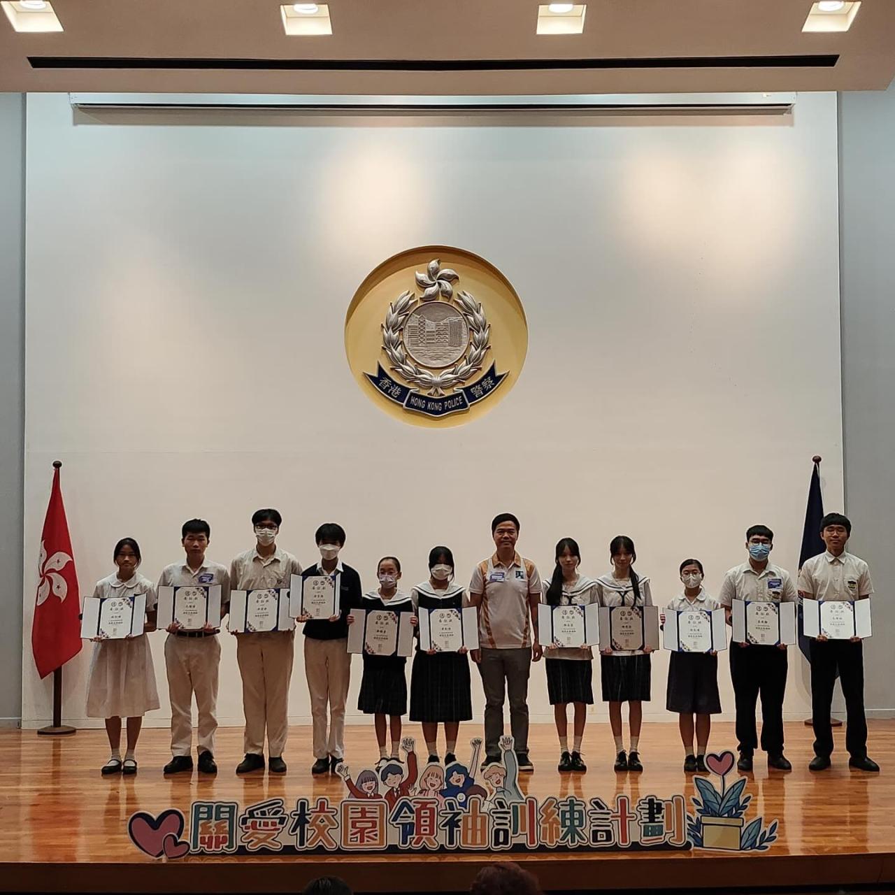 5月19日(星期日),本校4B張凱怡同學、4C毛健博同學、4D許宏錡同學及3D陳子朗同學,出席灣仔警區「關愛校園領袖訓練計劃」的訓練及委任儀式,獲委任為「學校心靈健康領袖」。委任儀式由港島總區指揮官郭嘉銓警務處助理處長擔任主禮嘉賓,另外由東區警區指揮官陳天柱總警司頒發委任狀給予東區參與的同學成為「關愛校園領袖」。計劃旨在加強學生對精神健康議題的關注及支援,期望一眾「關愛校園領袖」在校內傳達正能量。