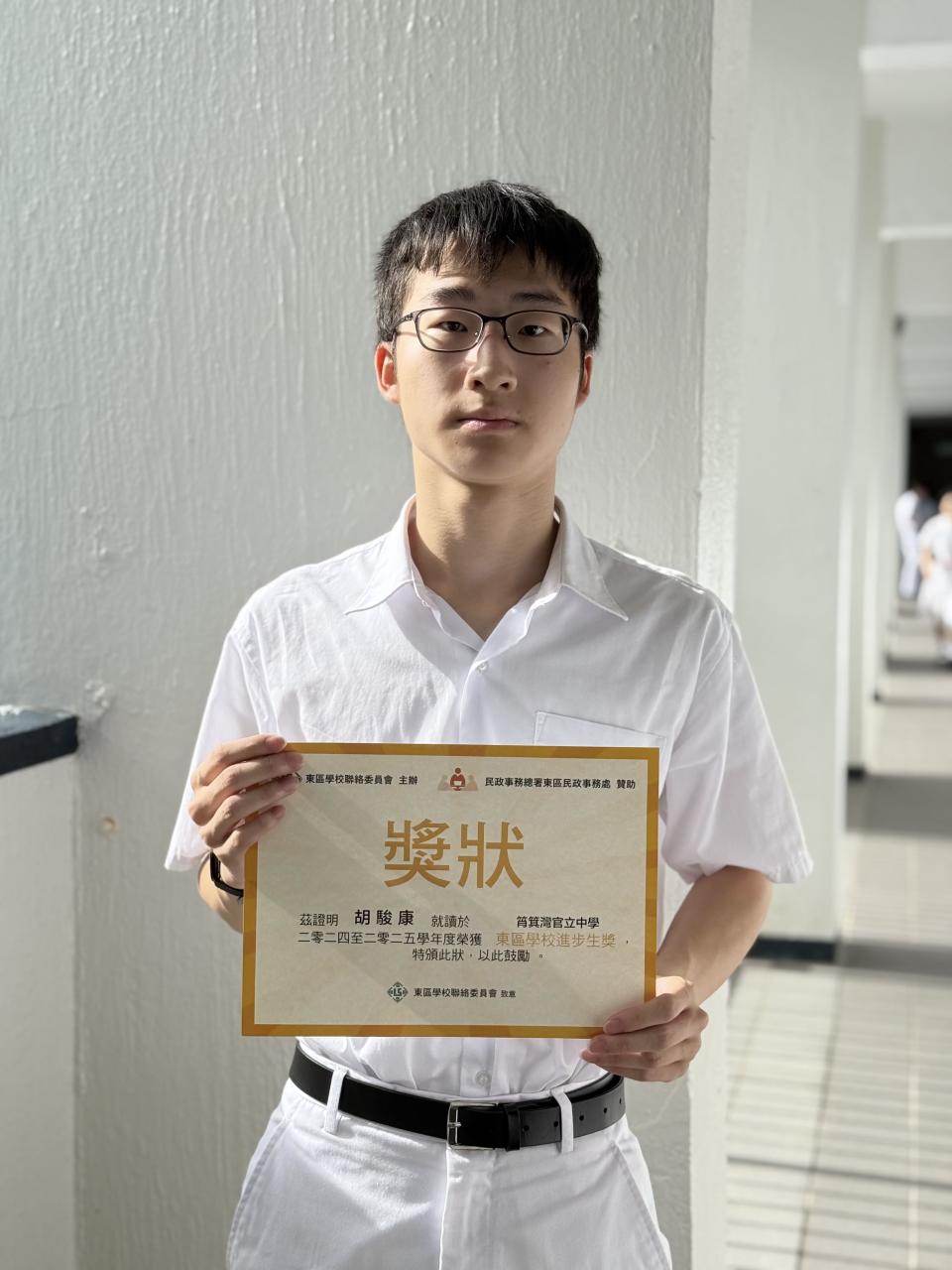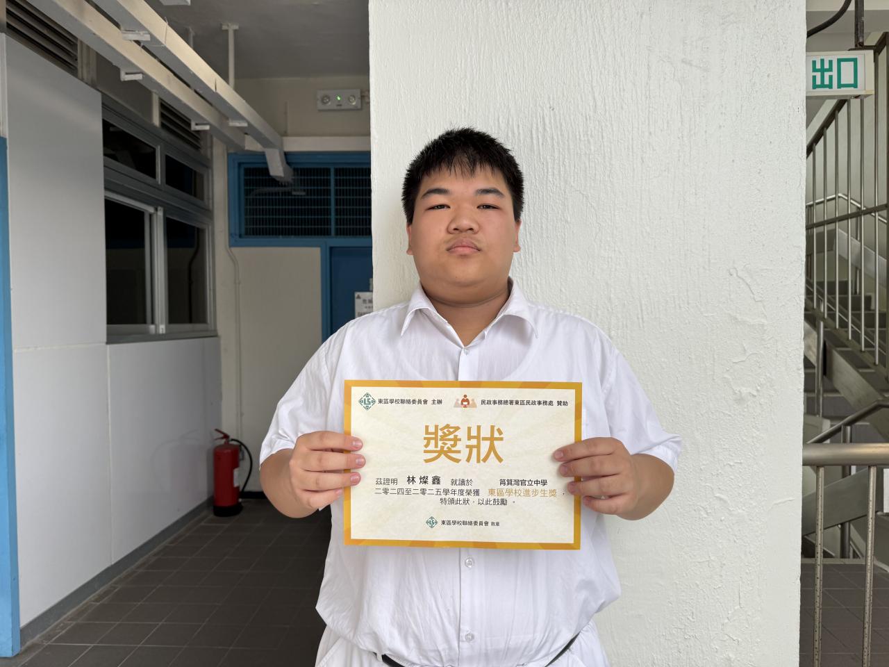 另外6D吳靖晞、5A胡駿康、4A黃寶鋌、3D林燦鑫及2D賴景希獲東區學校進步生獎,以表揚同學在本年度上學期成績有顯著進步。