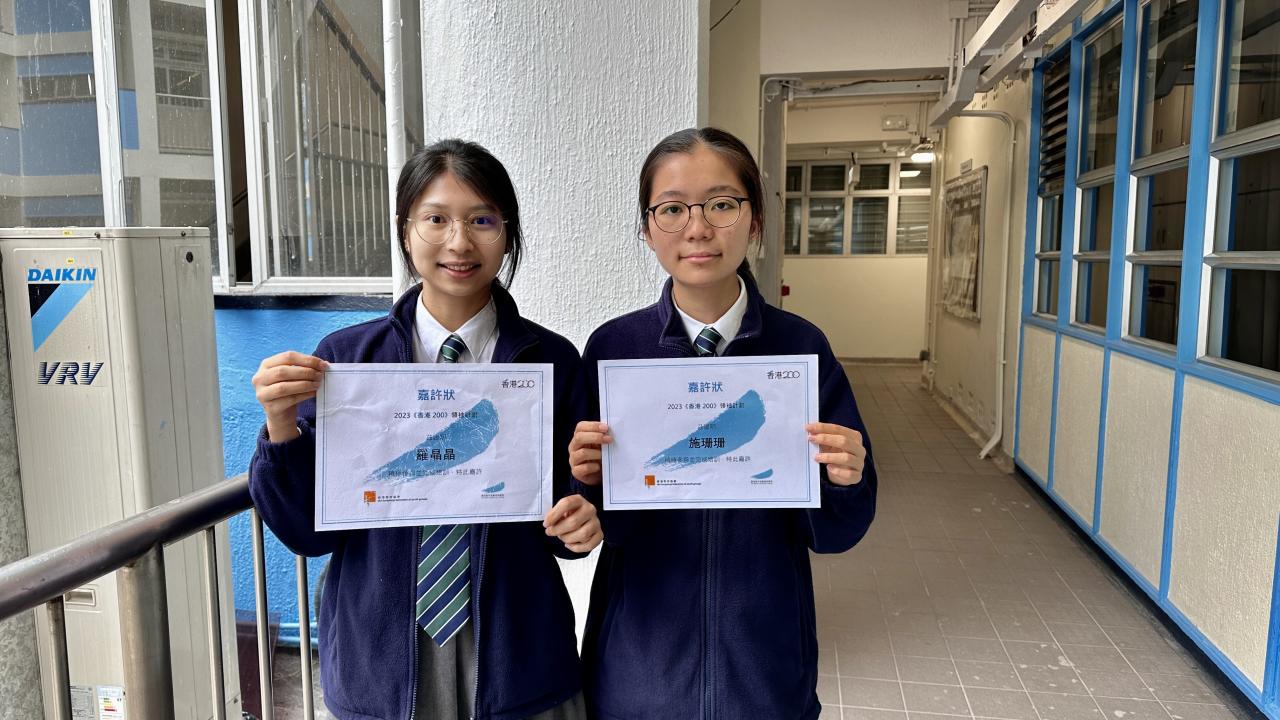 Shi Shan Shan of 5D and Lao Ching Ching of 5C got the Hong Kong 200 Award organized by The HKFYG Leadership Institute. "Hong Kong 200" is one of the key programmes of “HSBC Future Skills Development Project”. It provides a comprehensive, professional and forward-looking leadership training experience for secondary school students with outstanding potential to meet future challenges, and shoulder the task of promoting social development.